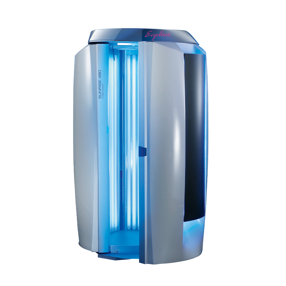 The Ergoline Sunrise 480‘s tremendous tanning power makes it the envy of all other stand-up units! Generously equipped with 48 x 200-watt Turbo Power UV lamps, it features a quick 9-minute maximum exposure schedule and ensures total body coverage.48 Turbo power UV lamps at 200 watts eachSilent cooling ventilation system3D sound with MP3 player connection